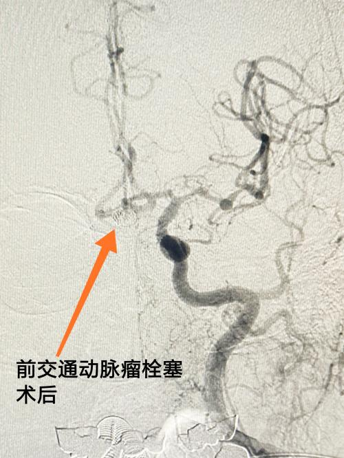 在全麻下急癥給予介入治療,造影發(fā)現(xiàn)前交通動脈不規(guī)則膨大,約7.8*6.1mm,且瘤體上有子瘤,向患者家屬交代病情,通過SL-10微導(dǎo)管放置ATLAS支架覆蓋前交通動脈瘤,通過Echelon10微導(dǎo)管依次放置不同規(guī)格彈簧圈6枚。造影顯示動脈瘤不再顯影,載瘤動脈及其分支通暢。歷經(jīng)3個多小時的手術(shù),完成全腦動脈造影術(shù)+經(jīng)導(dǎo)管顱內(nèi)動脈瘤彈簧圈栓塞術(shù),成功拆除“顱內(nèi)炸彈”,術(shù)后患者病情穩(wěn)定,頭痛明顯減輕,四肢活動正常,患者及家屬非常滿意,表示感謝。