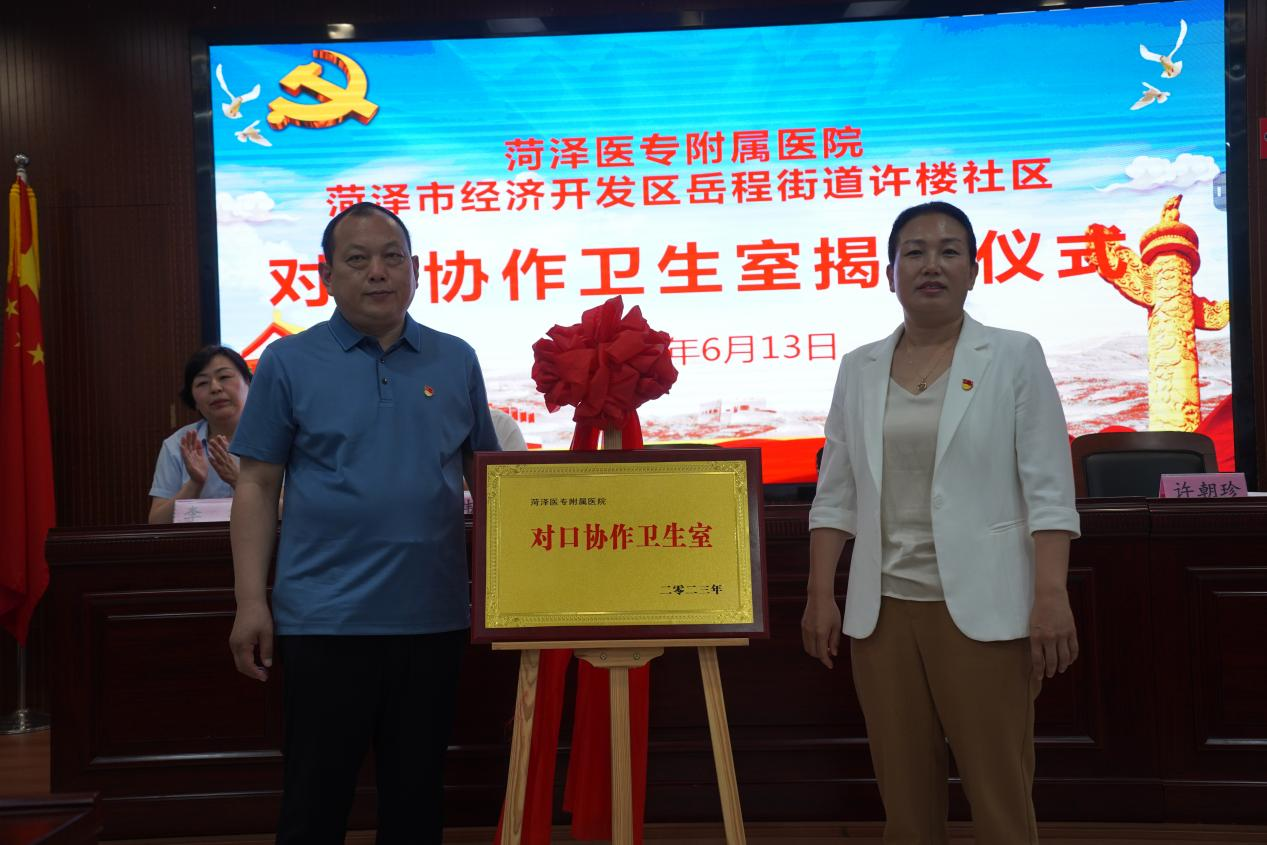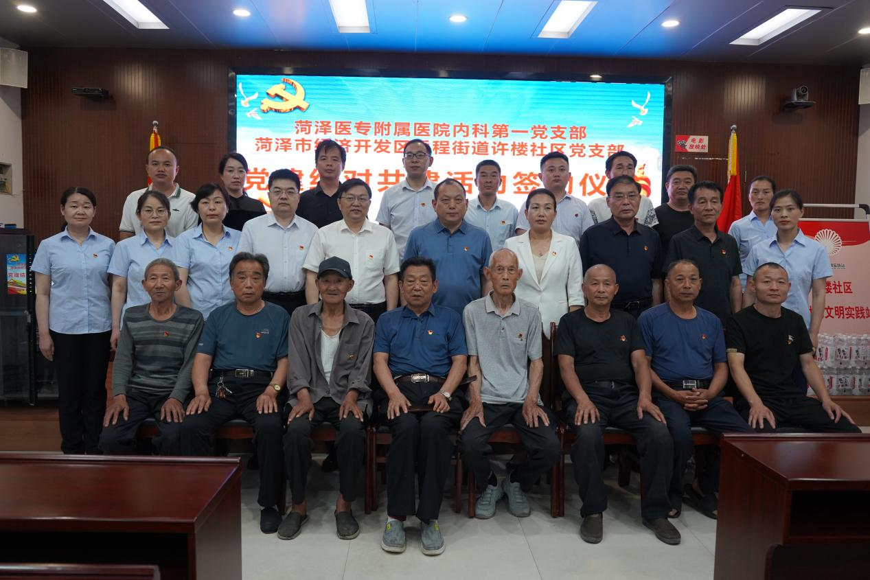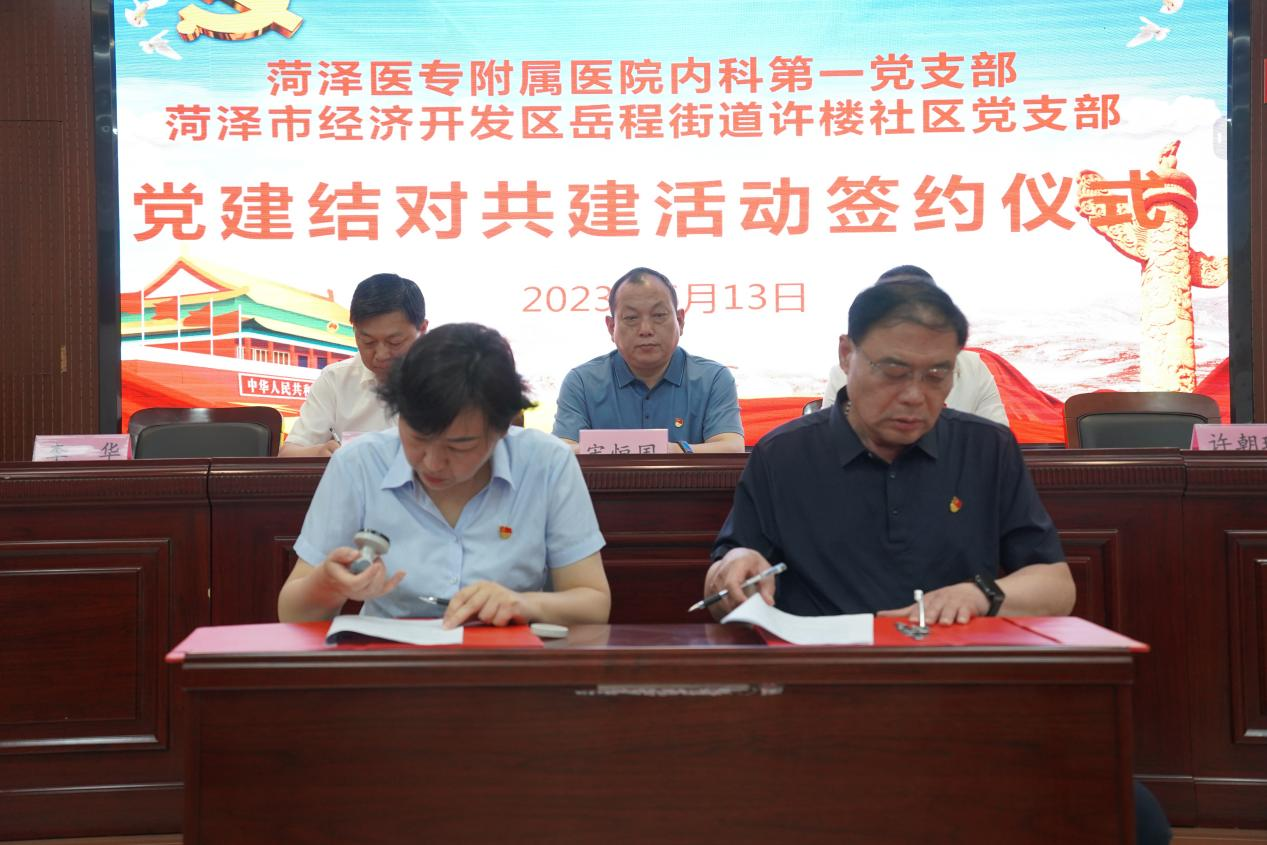 菏澤醫(yī)專附屬醫(yī)院內(nèi)科第一黨支部書記李華與岳程街道許樓社區(qū)黨支部書記許朝珍共同簽署了《黨支部結(jié)對共建協(xié)議書》。