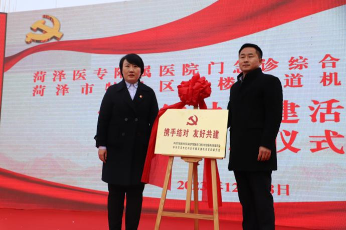 儀式上,菏澤醫(yī)院附屬醫(yī)院門急診綜合服務黨支部書記王琰霏與何樓街道黨工委副書記郭猛共同簽署了《黨支部結對共建協(xié)議書》,并進行揭牌。