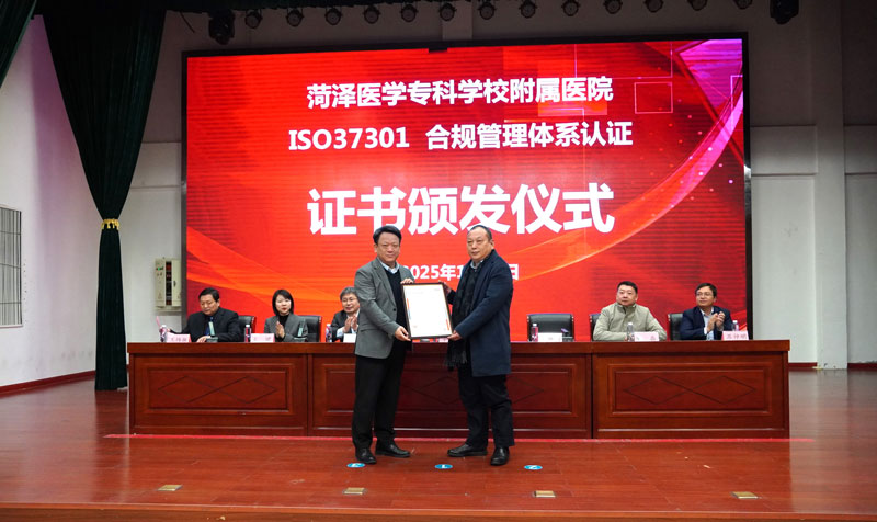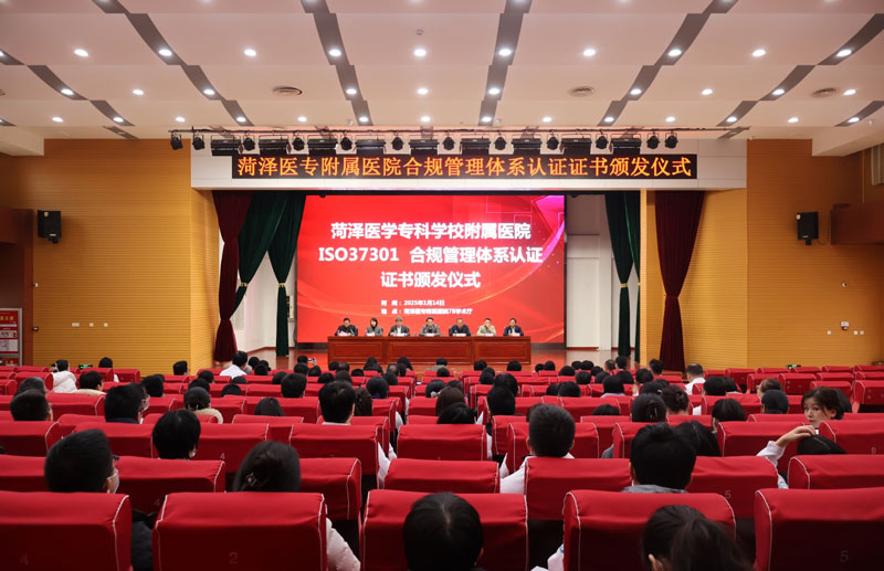 2025年1月14日,菏澤醫(yī)專附屬醫(yī)院合規(guī)管理體系頒證儀式在7B會(huì)堂舉行。SGS通標(biāo)標(biāo)準(zhǔn)技術(shù)服務(wù)有限公司副總裁辛斌、青島大學(xué)法學(xué)院教授牛傳勇、北京星來律師事務(wù)所主任王珺、醫(yī)院黨委書記宋恒國參加儀式,參加儀式的還有SGS通標(biāo)標(biāo)準(zhǔn)技術(shù)服務(wù)有限公司、青島大學(xué)、北京星來律師事務(wù)所的其他專家,菏澤醫(yī)專附屬醫(yī)院黨政班子成員和部分干部職工,以及法制日報(bào)社山東記者站、中國醫(yī)院院長雜志、菏澤市廣播電視臺(tái)、中國山東網(wǎng)等媒體。儀式由醫(yī)院黨委副書記王煒振主持。