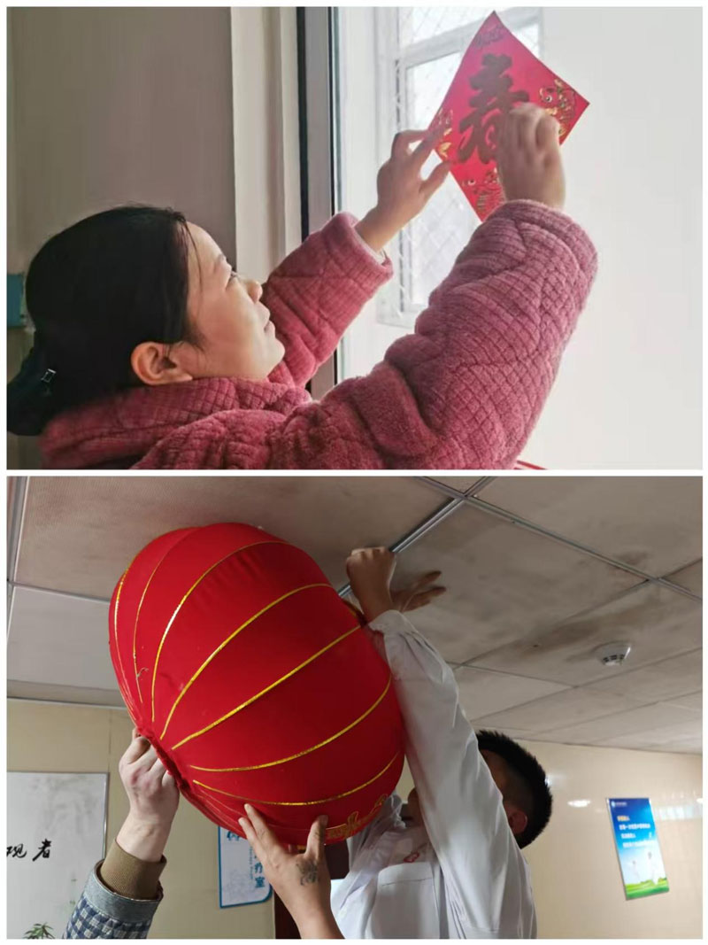 過年要有儀式感,醫(yī)護(hù)人員與患者一起動手布置病房。紅色的窗花、五彩的燈籠、喜慶的對聯(lián)……病房里被裝扮得煥然一新,處處洋溢著節(jié)日的喜慶?;颊叻e極參與其中,他們或幫忙貼窗花,或掛燈籠,每一個動作都透露出對新年的期盼和喜悅。