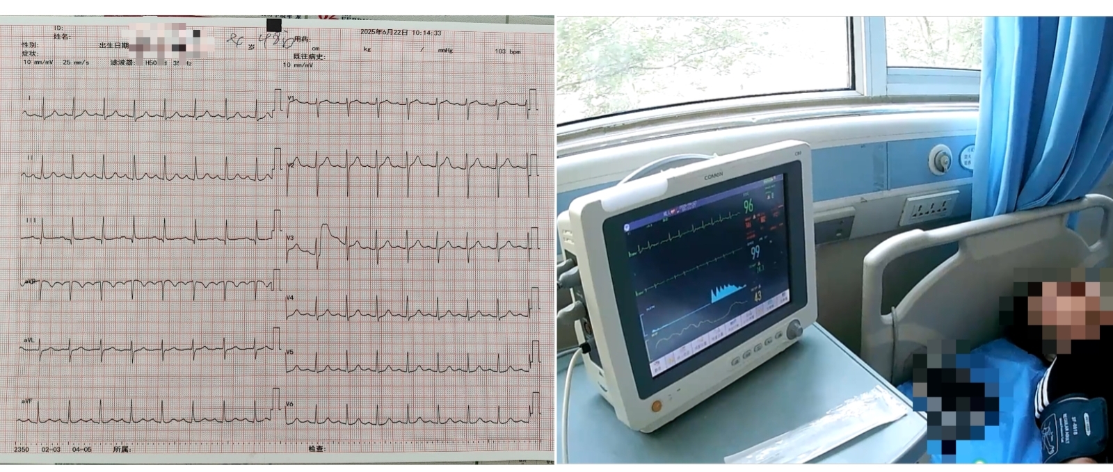 面對如此快速的心律失常,傳統(tǒng)方法通常需要靜脈注射藥物或進(jìn)行電復(fù)律。然而,藥物可能有副作用,電復(fù)律則需要鎮(zhèn)靜,給患者帶來額外痛苦和風(fēng)險。我院急診科搶救團(tuán)隊快速評估患者狀況(意識、血壓、血氧、有無器質(zhì)性心臟病等),確認(rèn)符合改良瓦氏動作適應(yīng)癥。在這緊要關(guān)頭,當(dāng)機(jī)立斷,急診科主任杜修生副主任醫(yī)師決定嘗試這種國際指南推薦、但國內(nèi)急診應(yīng)用尚不廣泛的無創(chuàng)方法——改良瓦氏動作。與患者溝通并征得同意后,嘗試使用改良瓦氏動作來糾正室上速?!耙粫阒恍枰颠@個針管,然后我們協(xié)助你躺下來,把腿抬高,你配合我們就可以了,過程中有任何不舒服,你都可以告訴我們”,急診科搶救團(tuán)隊已做好操作前準(zhǔn)備,并隨時準(zhǔn)備處理突發(fā)的任何意外情況。