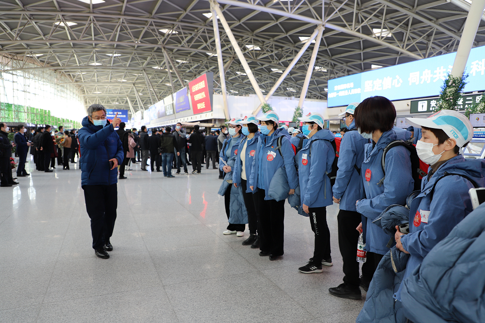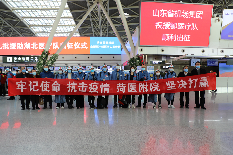 在濟(jì)南遙墻國(guó)際機(jī)場(chǎng),菏澤醫(yī)學(xué)??茖W(xué)校黨委書(shū)記于洲聲為10名勇士送行,并指出大家要認(rèn)真貫徹落實(shí)省委、省政府決策部署,全力以赴投入到湖北抗疫一線,發(fā)揮自己的專業(yè)特長(zhǎng),不辱使命,不負(fù)重托,圓滿完成救援任務(wù),打贏疫情防控阻擊戰(zhàn)。殷切囑托隊(duì)員們要安安全全去,平平安安回。