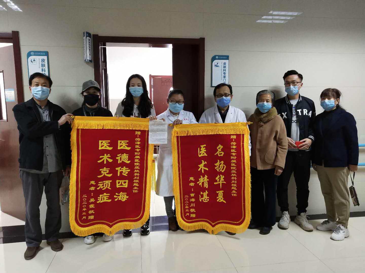 4月6日上午,在我院皮膚科上演了溫馨的一幕,患者袁某一家人手捧兩面寫(xiě)著“醫(yī)術(shù)精湛、名揚(yáng)華夏”“醫(yī)術(shù)克頑癥、醫(yī)德傳四海”字樣的錦旗和感謝信送至皮膚科劉根起主任手里。再三感謝劉主任對(duì)他們的精心治療與幫助,讓他們重新對(duì)生活充滿了自信。