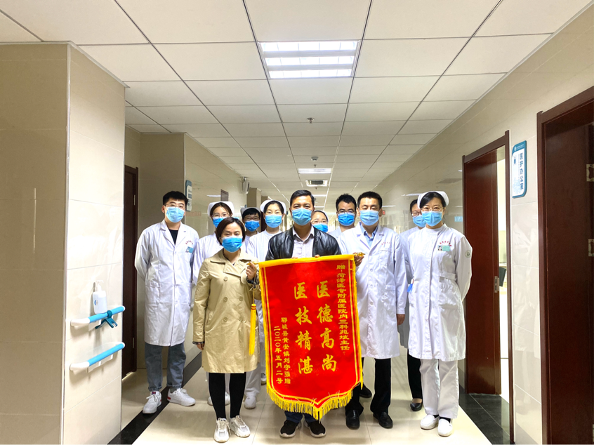 2020年5月7日一早,我院醫(yī)務科管采薇副主任及患者家屬將印著“醫(yī)德高尚  醫(yī)技精湛”的錦旗送至神經內科苑斌主任手中,以表達對神經內科苑斌主任及整個醫(yī)護團隊的感激之情。