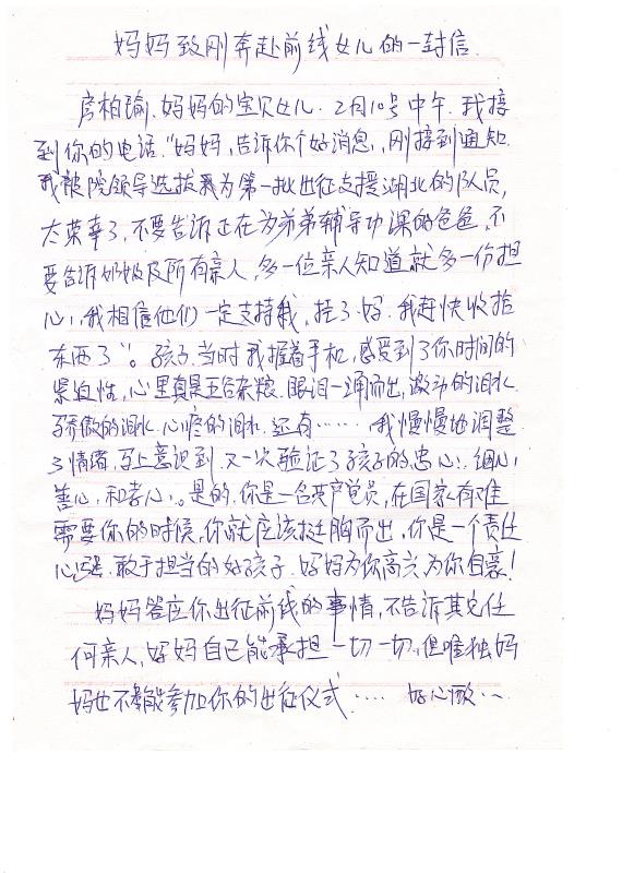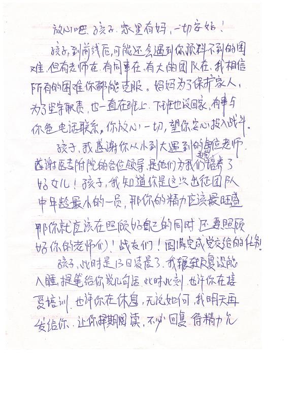 孩子,到前線后,可能還會(huì)遇到你預(yù)料不到的困難,但有老師在,有同事在,有大的團(tuán)隊(duì)在,我相信所有的困難你都能克服。媽媽為了保護(hù)家人,為了堅(jiān)守職責(zé),也一直在班上,下班也沒回家,有事與你爸電話聯(lián)系,你放心一切,望你安心投入戰(zhàn)斗。