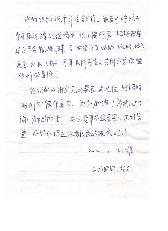 爸媽的心肝寶貝,再最后,你要記住,媽媽時(shí)時(shí)刻刻陪伴著你,為你加油!為武漢加油!為中國加油!決不能辜負(fù)領(lǐng)導(dǎo)寄予你的厚望,好好珍惜這次成長的機(jī)會(huì)吧!
