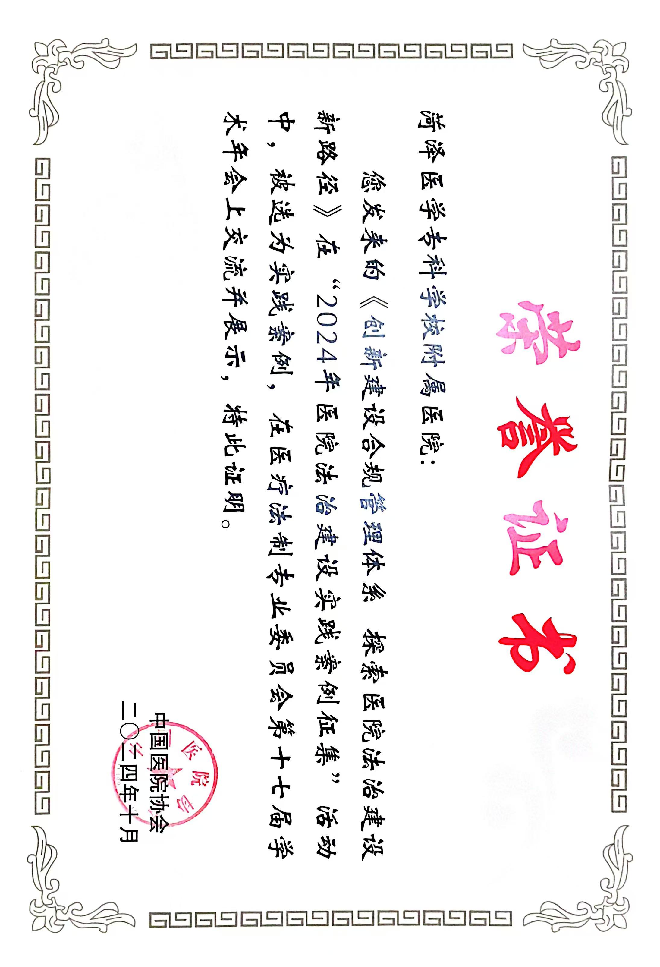 11月8日—10日中國醫(yī)院協(xié)會醫(yī)療法制專業(yè)委員會第四屆委員會第四次全體會議暨第十七屆學術年會在福州舉行。菏澤醫(yī)學專科學校附屬醫(yī)院提交的“創(chuàng)新建設合規(guī)管理體系 探索醫(yī)院法治建設新路徑”案例榮獲醫(yī)院法治建設實踐案例獎并在學術成果展示專區(qū)進行交流展示,成為菏澤市唯一一家入選中國醫(yī)院協(xié)會評選的法治醫(yī)院建設先進單位。
