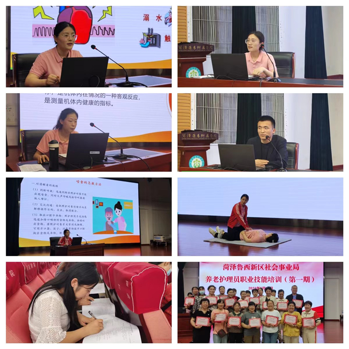 此次培訓(xùn)采取理論授課、實際操作和案例分析相結(jié)合的方式,分別從老年人日常生活護理、常見疾病護理、安全防護護理、突發(fā)險情急救等方面進行集中授課。在培訓(xùn)現(xiàn)場,授課老師們通過理論和實踐相結(jié)合的方式,認(rèn)真、細致地為每位學(xué)員講解和分析,學(xué)員聽到重點時,紛紛拍照留存或記下筆記。菏澤醫(yī)專附屬醫(yī)院還安排學(xué)員進行技能實操練習(xí),把理論知識融入實訓(xùn)操作,進一步深化他們對養(yǎng)老護理技能的理解和認(rèn)識,有效提升學(xué)員認(rèn)知水平和照護能力。