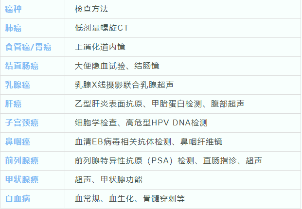 防癌體檢是早期發(fā)現(xiàn)癌癥的最重要的途徑。專業(yè)的防癌體檢是代價(jià)最小、痛苦最少、最值得提倡的方法。防癌體檢,不同于一般的健康體檢,特指腫瘤專家結(jié)合體檢者的自身情況和個(gè)體需求,做相應(yīng)部位的防癌檢查。如防肺癌體檢,體檢時(shí)注重肺部CT檢查;懷疑有胃癌或有高危胃癌家族史的病人,可重點(diǎn)做胃鏡檢查;肛門指診是普查直腸癌的簡(jiǎn)單方法,長(zhǎng)期便血或者大便習(xí)慣異常者必查。主要推薦的檢查項(xiàng)目包括: