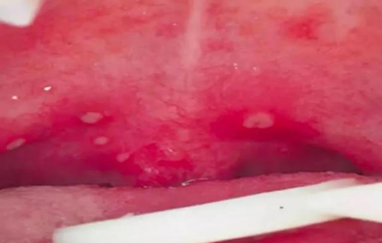 癥狀特點:突發(fā)高熱,咽部見小紅點,隨后成小水泡,最后破潰成潰瘍,皰疹性咽峽炎的皰疹僅僅出現(xiàn)在口腔內(nèi),起初皰疹為灰白色的小丘疹,周圍紅暈,以后變成發(fā)亮的皰疹,破潰以后變成小潰瘍。