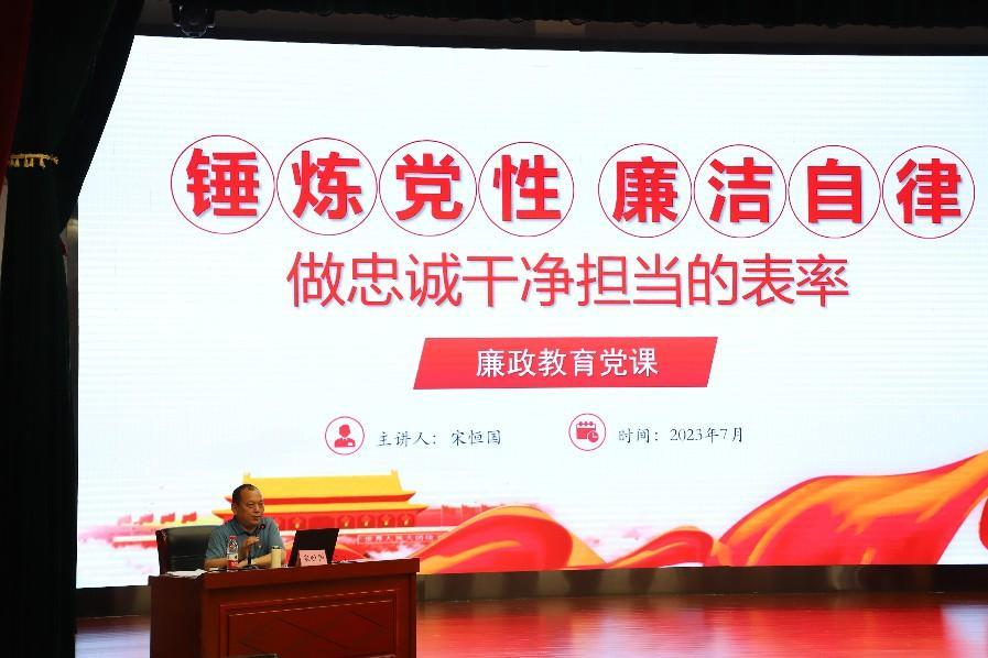 會(huì)上,黨委書記宋恒國以《錘煉黨性 廉潔自律 做忠誠干凈擔(dān)當(dāng)?shù)谋砺省窞橹黝},從講黨性重品行、敢作為勇?lián)?dāng)、守紀(jì)律改作風(fēng)三個(gè)方面多維度深層次給大家上了一堂專題黨課。