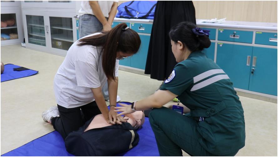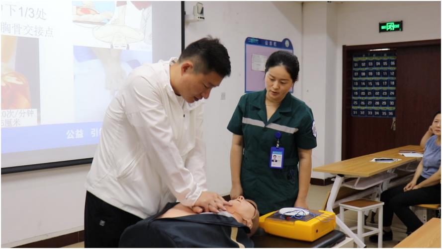 “心肺按壓時(shí),要雙手掌根重疊,置于患者兩乳頭連線中點(diǎn),雙臂繃直與患者垂直,以腕關(guān)節(jié)為支點(diǎn),開始按壓?!痹诤蕽舍t(yī)專附屬醫(yī)院醫(yī)護(hù)實(shí)訓(xùn)中心樓內(nèi),急診醫(yī)學(xué)科負(fù)責(zé)人、副主任醫(yī)師杜修生一邊講解一邊示范:“施救者可一邊按壓一邊數(shù)數(shù):01、02、03……”